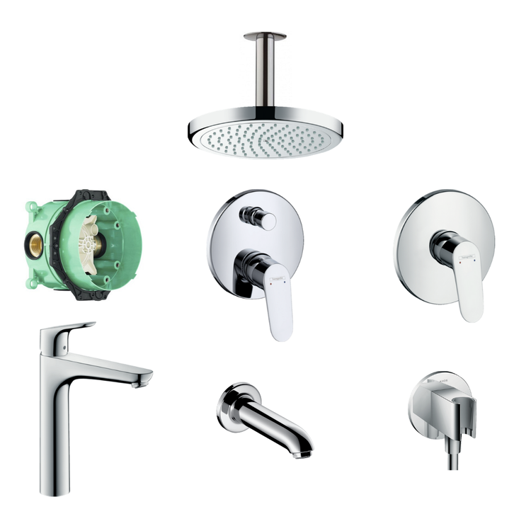 ست شیرآلات توکار هانس گروهه مدل Focus با متعلقات کد KH1076 شامل یک سرویس شیر روشویی بلند، شیر توالت توکار با مغزی، خروجی و هولدر شلنگ، شیر حمام توکار با مغزی، شیروان پرکن (پاشور) و براکت، سردوش گرد و بازوی سقفی است.