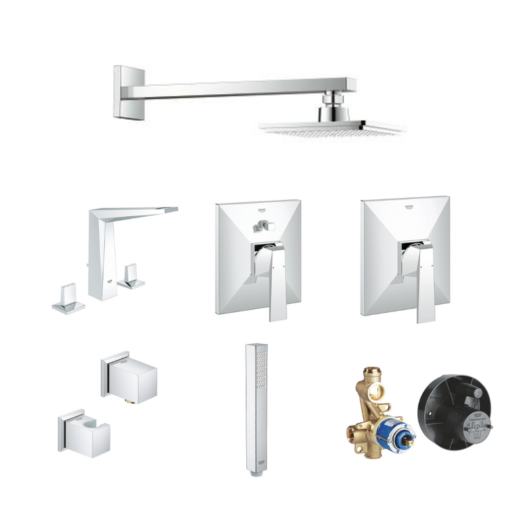 ست شیرآلات توکار گروهه مدل Allure Brilliant با متعلقات کد KGR1054 شامل یک شیر روشویی اردکی (سه تکه)، شیر توالت توکار با مغزی، شیر حمام توکار با مغزی، زانو توکار، هولدر توکار، دوش دستی و براکت، سردوش مربع و بازوی دیواری است.