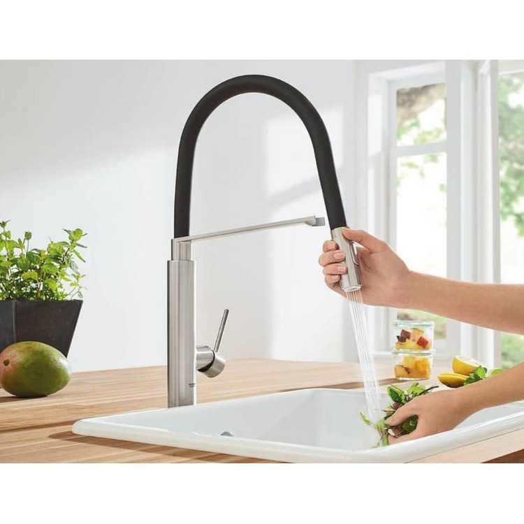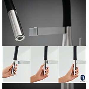 تمیز کردن این شیر آشپرخانه به لطف شلنگ سیلیکونی بهداشتی GROHFlexx و نازل های اسپری سیلیکونی SpeedClean که می توانید آهک ها را با انگشتان پاک کنید بسیار آسان است.